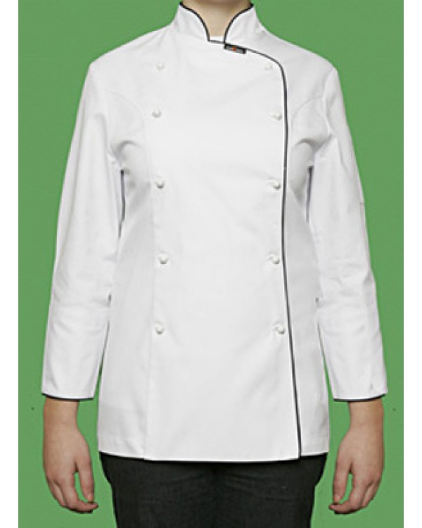 Bayan Aşçı Forması Lacivert Şeritli (biyeli) üst forma olarak alpaka kumaş %65′i polyester %35′i pamuk belden oturtmalı yandan yırtmaçlı arkan kuşaklı ve pensli ve uzun kolu, kısa kollu eybiSSe iş Elbiseleri Modelidir.