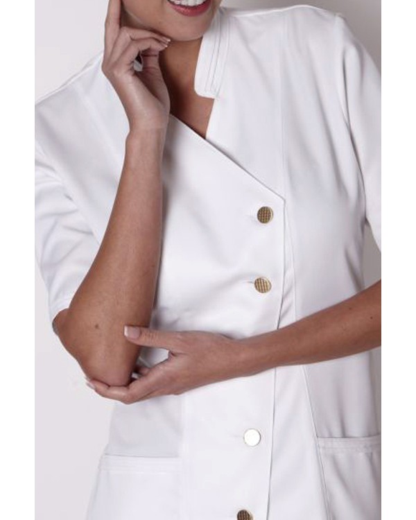 Hakim Yaka Çapraz Model Hemşire Elbisesi Sadece üst olarak alpaka veya gabardin kumaş %65′i polyester %35′i pamuktur.